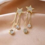Premium gold star dangle earrings designed with sparkling crystal stones and elegant hanging chains. The stylish star shape combined with shimmering crystal drops creates a modern and glamorous look. Lightweight and comfortable for daily wear, parties, weddings, and festive occasions. This trendy fashion jewellery piece enhances both traditional and western outfits, making it a perfect gift choice for women and girls.